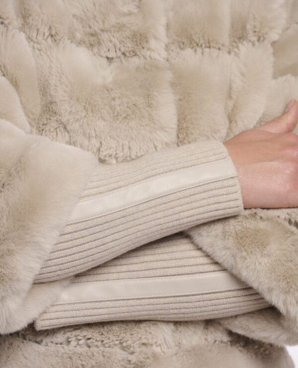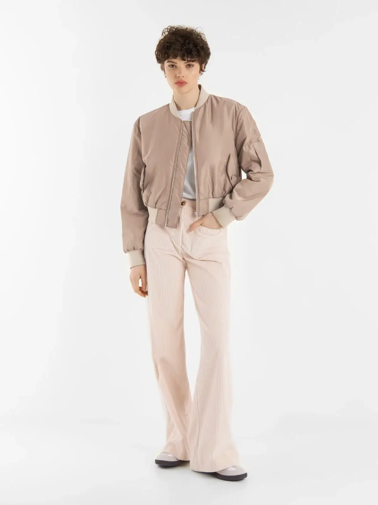 Klassischer Bomberjacken-Schnitt , zwei seitliche Pattentaschen mit Druckknopf, elastische Bündchen an Ärmeln, Kragen und Saum