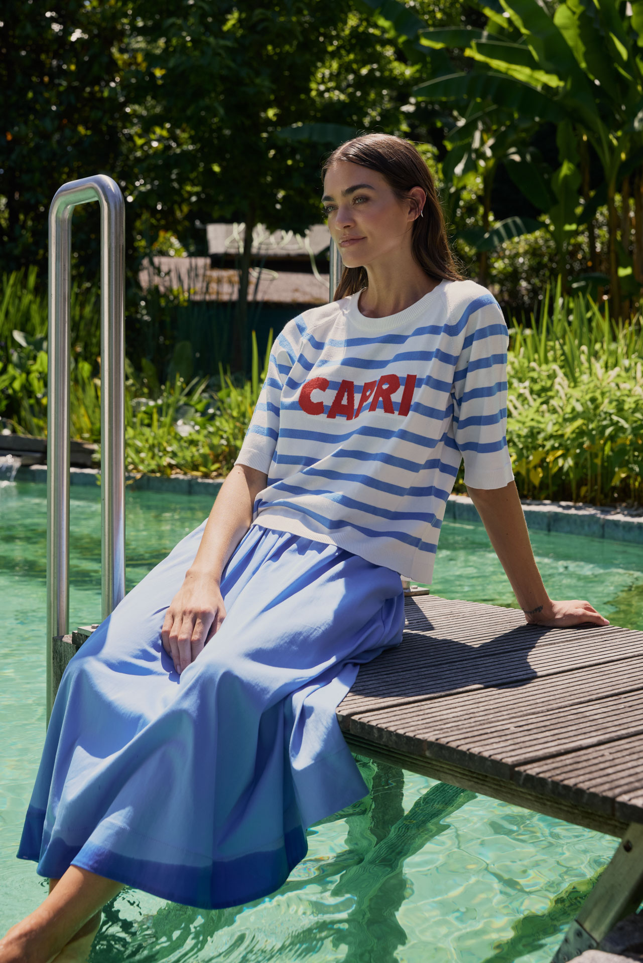 Oversize Pullover mit 1/2 Ärmeln von Milano Italy in blauem und rotem Print.