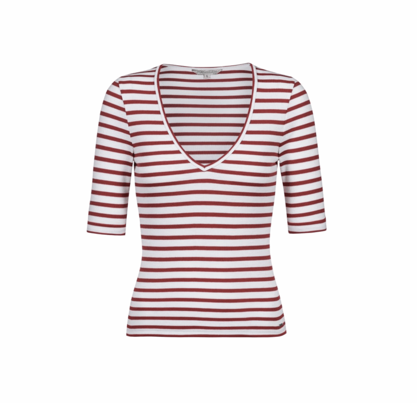 Rippshirt mit V Ausschnitt und halbem Arm. Rot-weiß gestreift